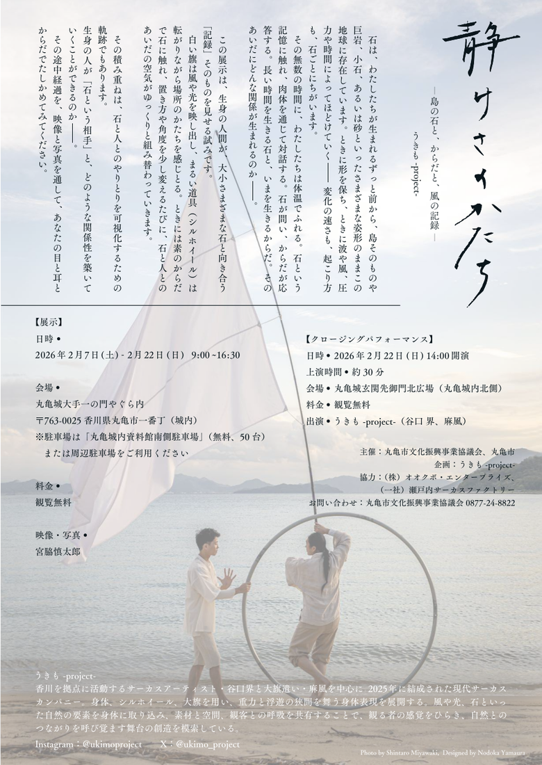 2025年に結成された現代サーカスカンパニー「うきも-project-」が丸亀市広島にて「石」をテーマに制作した映像作品の展示会を開催します。本展示会は、生身の人間が、大小さまざまな石と向き合う「記録」そのものを見せるパフォーマンスとなっており、石との対話を通じて紡がれた作品を通じ、アーティストの感性に触れていただける貴重な機会です。